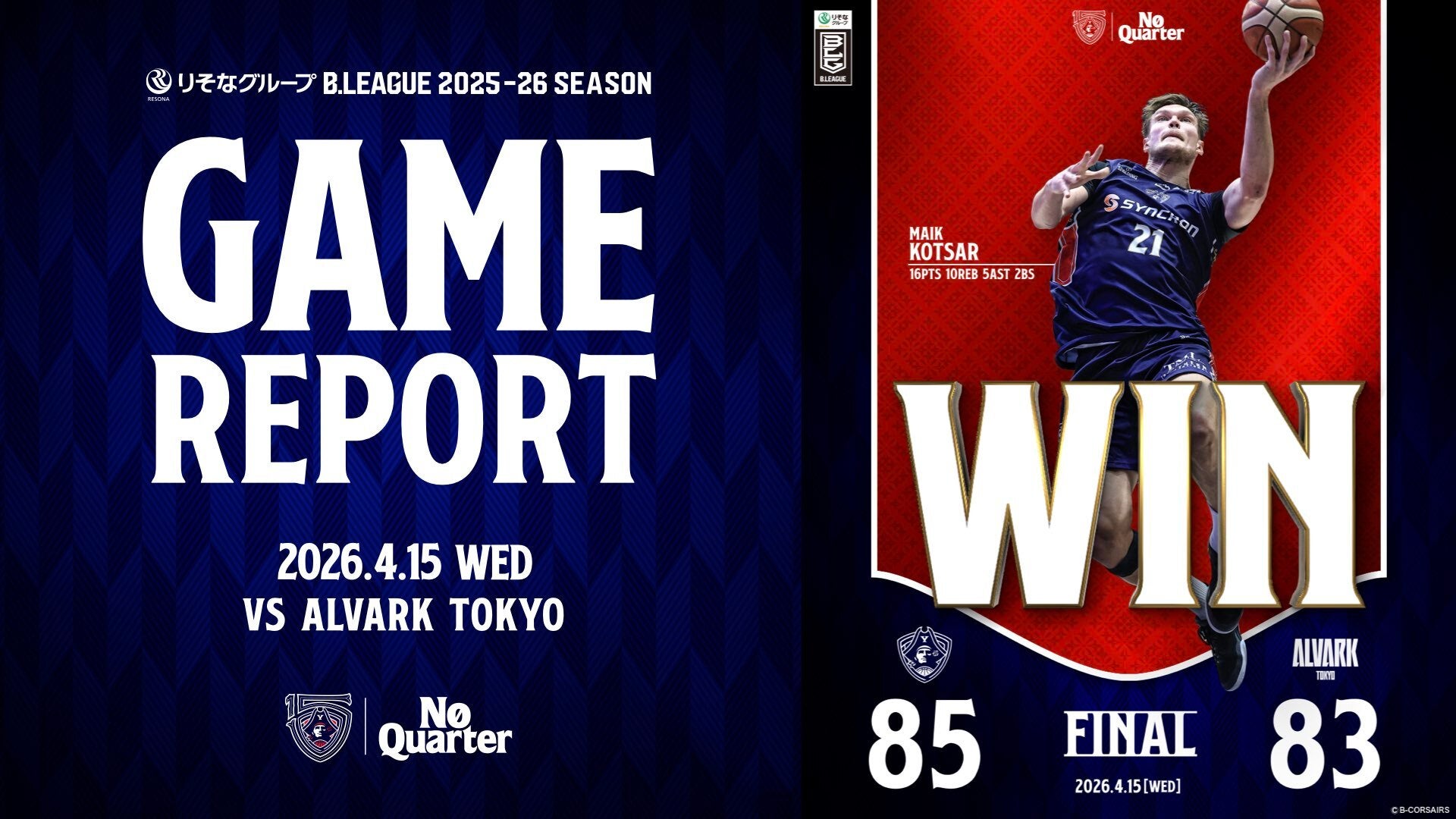 4/14(火)更新【イベント情報】4/15(水)A東京戦「JRAウインズ横浜 presents 横浜ビー・コルセアーズ vs アルバルク東京」