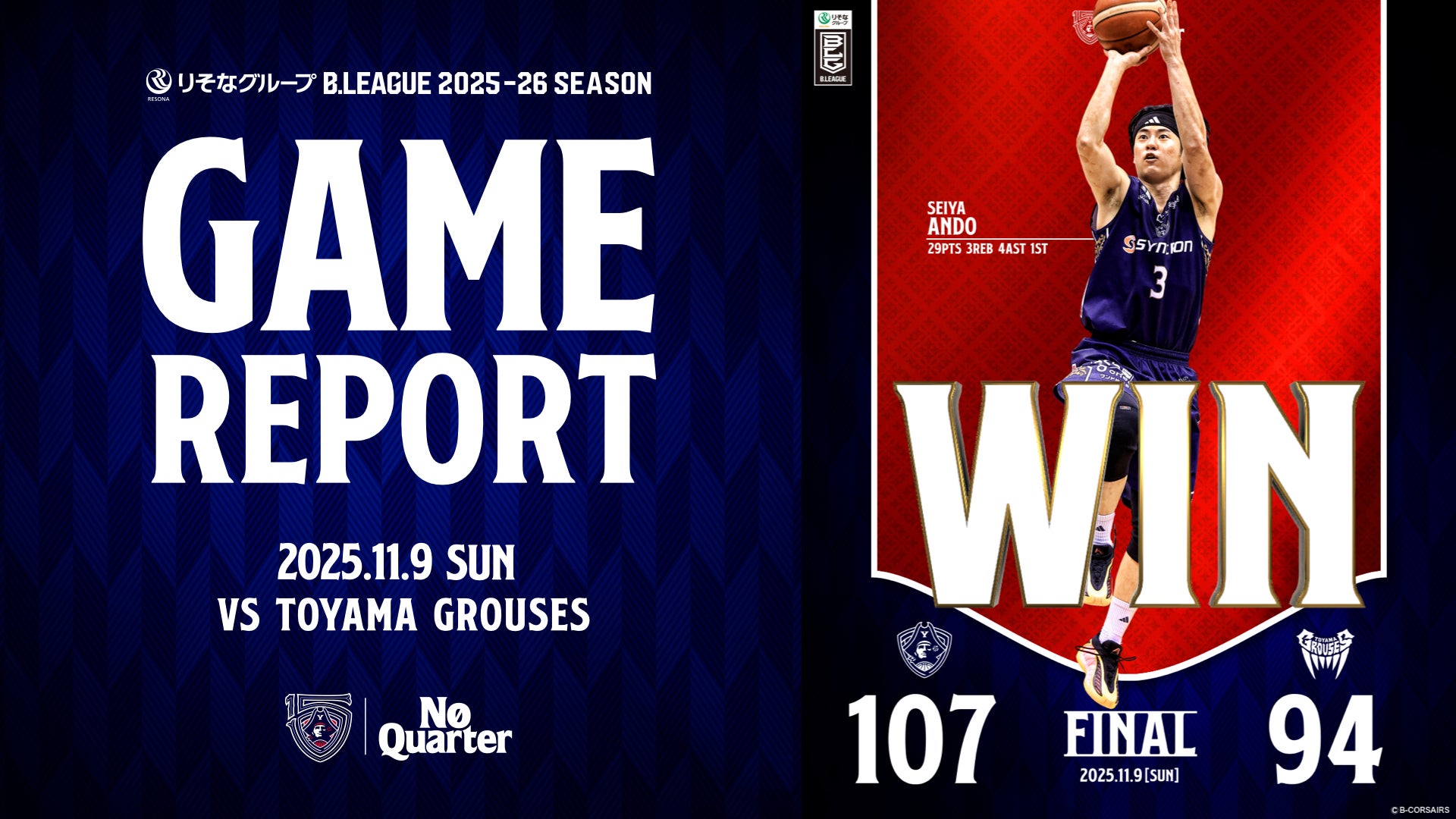 【GAME REPORT】 りそなグループ B.LEAGUE 2025-26 SEASON 第9節 vs 富山 GAME2
