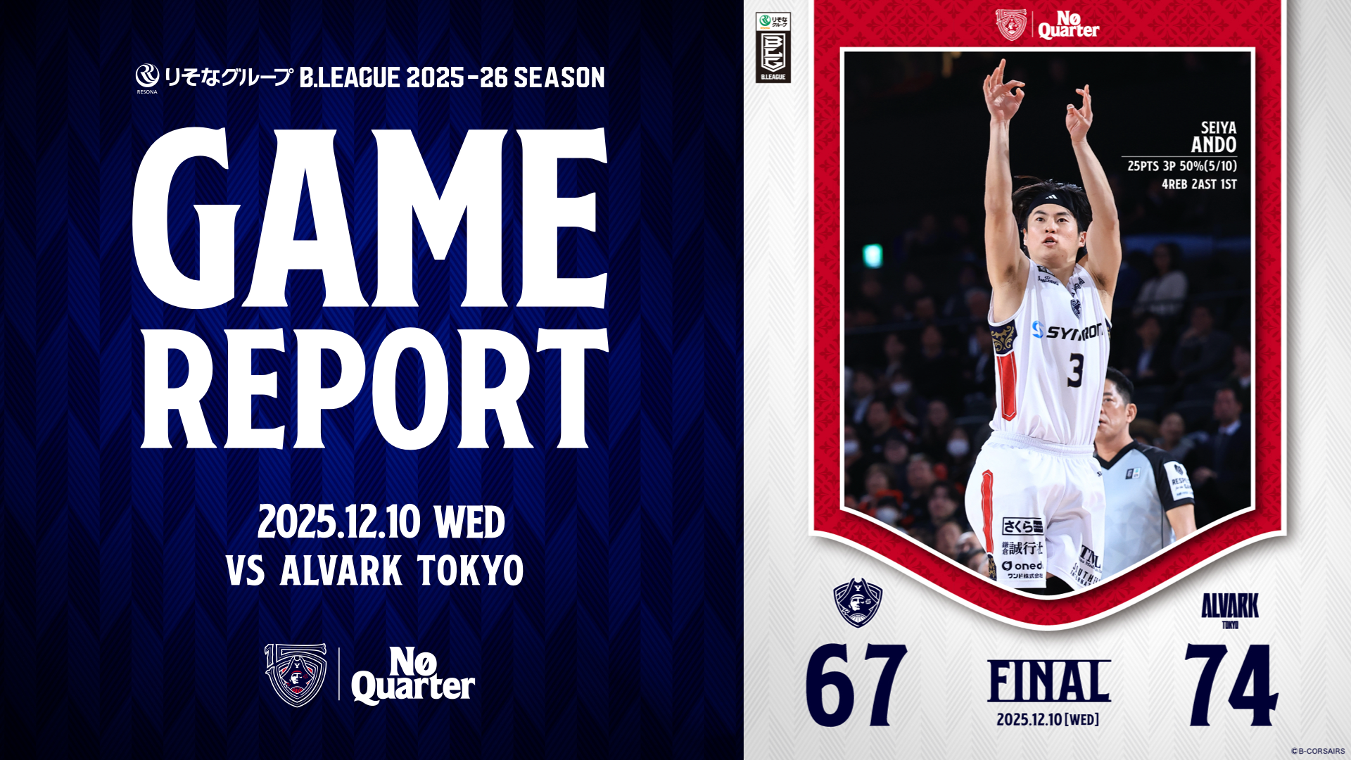 【GAME REPORT】 りそなグループ B.LEAGUE 2025-26 SEASON 第13節 vs A東京