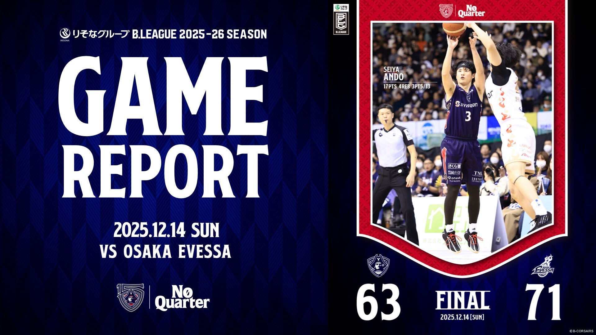 【GAME REPORT】 りそなグループ B.LEAGUE 2025-26 SEASON 第14節 vs 大阪 GAME1