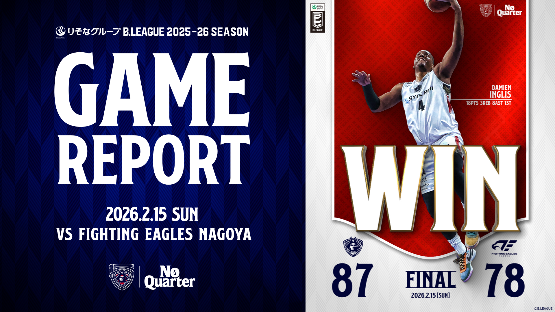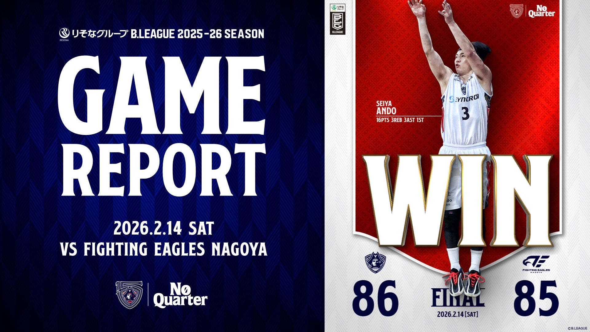 【GAME REPORT】 りそなグループ B.LEAGUE 2025-26 SEASON 第23節 vs FE名古屋 GAME2